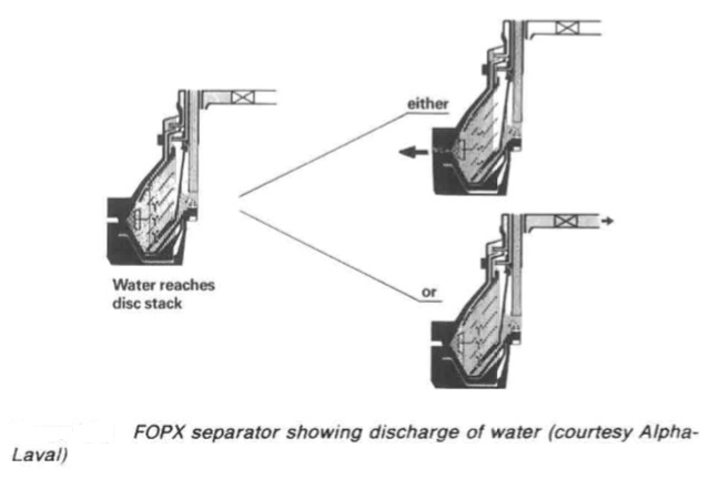 As the interface moves inwards, but before reaching the disc stack, water droplets flow through to reach a water sensing transducer (Figure 3). Via micro-processor circuitry, the transducer causes the bowl to self-sludge or the water to be discharged through the water drain valve. The system is said to be capable of handling fuels with densities as high as 1010 kg/m3 at 15 deg C